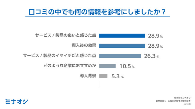 本調査において、導入検討した業務支援システムのなかで最も回答が多かった「勤怠管理システム」について、「口コミにおいて、どのような情報を参考にしましたか?」と質問。(n=38)