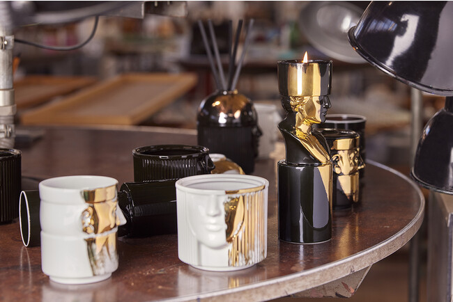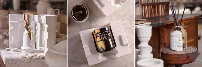 現代のルネサンスに邁進すべく、イタリア人デザイナー、ルカ・ニケットの機知に富んだセンスとデザイン力で2021年に誕生したLCDCコレクションは、中世イタリアの芸術のパトロンでもあったメディチ家の出身でフランス王妃となったカテリーナ・デ・メディチの、フィレンツェからパリへのお輿入れに随行した従者たちをモチーフにしたデザインと5種の香りで構成されています。今回誕生したLCDC Goldは、L’Amazzone(アマッツォーネ:アマゾネス)、 L’Amante(アマンテ: 恋人)、Il Letterato(レッテラート: 学者)、Il Seguace(セグアーチェ: 従者)、Il Favorito(ファヴォリート: お気に入り)、Il Frate(フラーテ: 修道士)、 La Dama(ダーマ: 貴婦人)、 L’Addetto al Fuoco(アデット アル フオーコ: 火の使者)という8キャラクターをデザインモチーフにしたLCDCコレクションのうち、レッテラート(学者)とセグアーチェ(従者)、アマッツォーネ(アマゾネス)という3モチーフの磁器に輝きを放つゴールドの筆跡を施したスペシャルエディションです。ホワイト&ゴールドとブラック&ゴールドの2色展開からなり、キャンドルホルダーとフレグランスディフューザーで構成されています。
