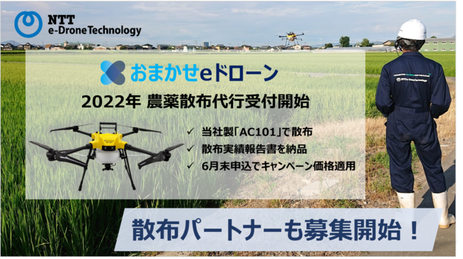 株式会社NTT e-Drone Technology(埼玉県朝霞市北原2-4-23 代表取締役社長:田辺 博)は、「おまかせeドローン(農薬散布代行)」について、これまでの利用状況並びにご要望をふまえて、以下のとおり提供条件を見直したうえで、2022年分の受付を開始します。加えて、当社製農業ドローン「AC101」を用いて散布代行作業を実施可能な散布パートナーを募集いたします。