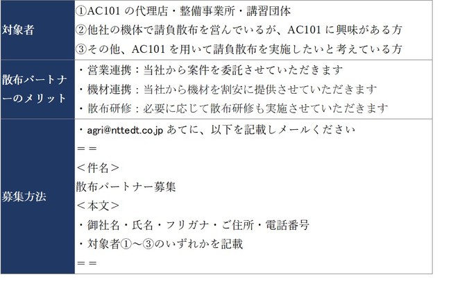 サービス提供開始以降、当社社員のみでオペレーターを担当してきましたが、需要がさらに拡大していることから、散布パートナーを募集いたします。