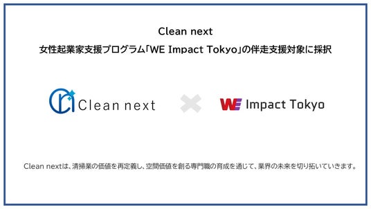 株式会社Clean next(東京都・代表 西山貴代)は、社会的・経済的インパクト創出を目指す女性起業家支援「WE Impact Tokyo」の伴走支援対象に選ばれました。