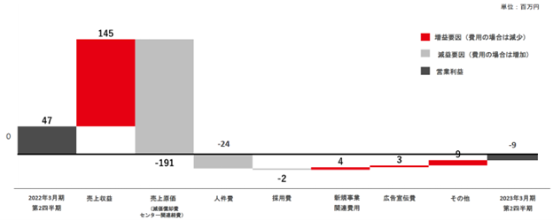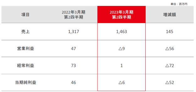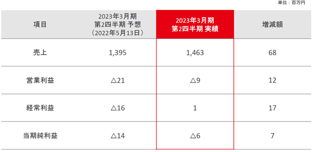 ・2023年3月期第2四半期の業績予想に対しては、売上高は68百万円増の1,463百万円、営業利益は12百万円増の△9百万円、経常利益は17百万円増の1百万円、当期純利益は7百万円増の△6百万円となりました。