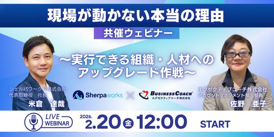 営業変革のプロフェッショナルであるシェルパワークス株式会社(本社:東京都千代田区、代表取締役社長:米倉達哉)は、人材・組織開発を支援するエグゼクティブコーチ株式会社(本社:東京都港区、代表取締役社長:出口亮輔)と共同で、2026年2月20日(金)「現場が動かない本当の理由 ─ 実行できる組織・人材へのアップグレード作戦」と題した共催ウェビナーを開催いたします。