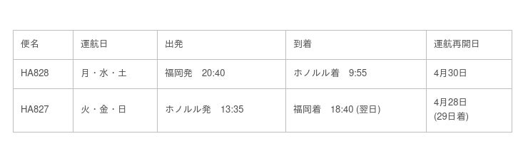 当該路線は2019年11月に就航後、新型コロナウイルスの影響により2020年3月より運休しており、来月4月30日(福岡発)より週3便で運航再開いたします。より多くの福岡および九州のお客様がハワイに再び渡航いただけるよう、特別運賃を設定しています。