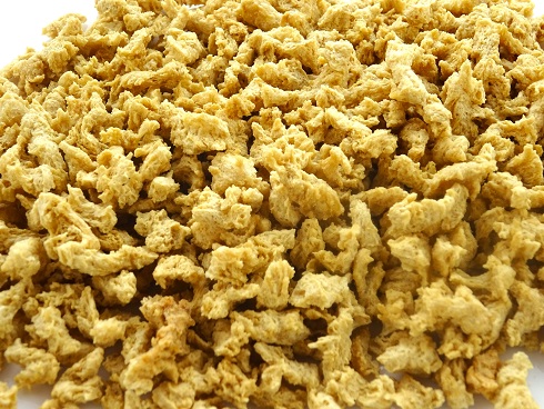 そして出来上がったものは、噛み応えが特徴の「プレミアム ソイミンチ」とは真逆のような、サクサクと軽い食感で、茹でることを必要としない大豆ミートです。