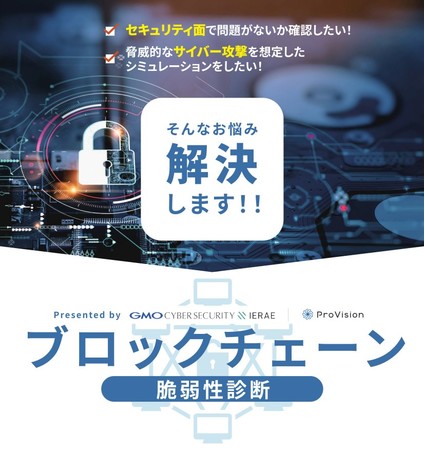 株式会社ProVision(横浜本社:神奈川県横浜市、社長:佐藤 瞳、以下:ProVision)は、2022年5月27日(金)、サイバーセキュリティ事業を専門とするGMOサイバーセキュリティ byイエラエ株式会社(本社:東京都渋谷区、代表取締役:牧田誠)と業務提携し、ブロックチェーンを活用したサービスにおける脆弱性診断を行う「ブロックチェーン脆弱性診断」を提供開始したことをお知らせいたします。