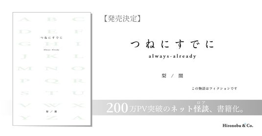 ひろのぶと株式会社(本社:東京都港区、代表取締役社長:田中泰延)は、新進気鋭のホラー作家・梨 × 株式会社 闇による新刊『つねにすでに』を2024年12月16日(月)に刊行いたします。本日11月5日(火)よりご予約いただけます。(※予約の受付状況は、店頭やサービスにより異なります)