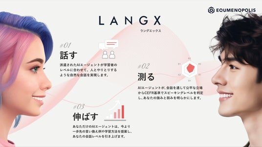 エキュメノポリスは、対話型診断・学習支援AIエージェントプラットフォーム「EQU AI Platform」を研究開発しています。このAIエージェントは、ユーザーの潜在能力や潜在ニーズを自然に引き出すような対話戦略を有し、その会話を通して得られるマルチモーダルな情報に基づく高度な診断・カウンセリング業務などを得意とします。第一弾の事業として、中学・高校・大学・社会人へのオンラインAI英会話サービス「LANGX(ラングエックス)」を全国展開しています。