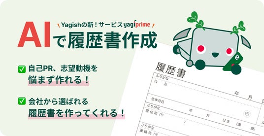 累計利用者1,000万人を達成した、国内最大級の履歴書作成サービス「yagish(ヤギッシュ)」、「yagioffer(ヤギオファー)事業」をぜひご活用ください。