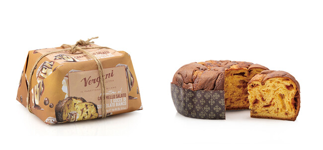 小麦粉、天然酵母、バター、新鮮な卵黄で作った伝統的なパネットーネ生地に、ホワイトチョコレートチップとソルティキャラメルを加えた豊かな味わいのパネットーネ。