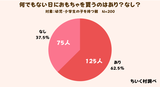 何でもない日子供におもちゃを買うのはあり?なし?と聞いたところ、「あり」と答えた人が200人中125人(63%)でした。