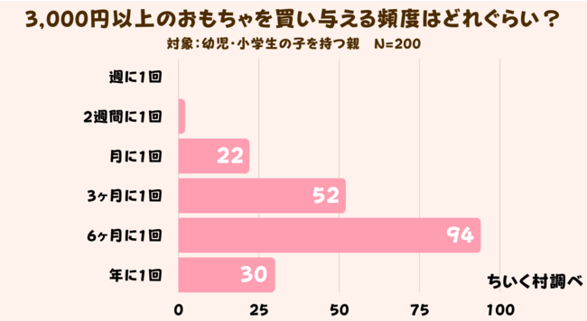 3,000円以上のおもちゃを買い与える頻度はどれぐらいか聞いてみたところ、半年に1回が200人中94人(47%)と1番多い結果でした。