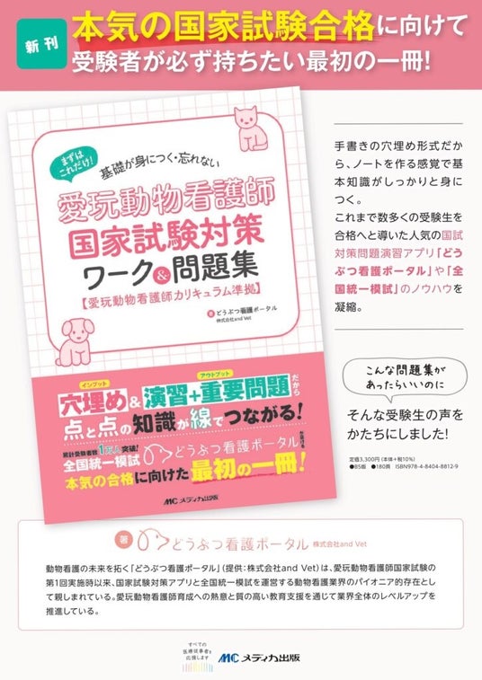 愛玩動物看護師国家試験の対策サービスの『どうぶつ看護ポータル』を提供する株式会社and Vet(東京都台東区、代表取締役 安岡 恵斗、以下、当社)は、2025年5月27日に愛玩動物看護師国家試験に向けた学習教材として『愛玩動物看護師国家試験対策ワーク&問題集』を株式会社メディカ出版(大阪府大阪市、代表取締役社長 長谷川 翔)より発売いたしましたので、お知らせいたします。