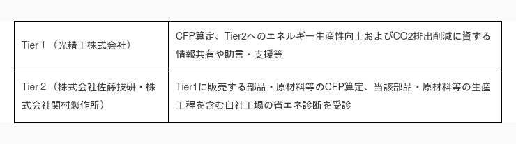 一方、Tier2は、共同事業体およびTier1の支援により、Tier1に販売する部品・原材料等のCFPを算定するとともに、当該部品・原材料等の生産工程を含む自社工場の省エネ診断を受診し、自社の課題を整理します。