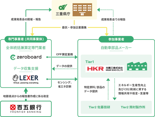 本事業は三重県が委託した専門事業者と、自動車メーカー(OEM)と直接取引がある事業者(Tier1)ならびにTier1と直接取引がある事業者(Tier2)が連携して行う、自動車CFPの算定・削減にかかる課題や対応の方向性等を整理し、それを県内の自動車関連企業等へ展開するための実証事業です。