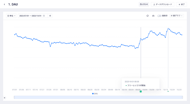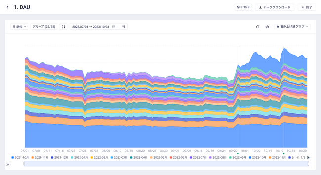 さらに、ユーザーの獲得や定着が含意されたMAUから、よりユーザーの動向を精緻に理解するために、DAU(日次のアクティブユーザー数)を確認してみると、10月中は全体として底上げされている。