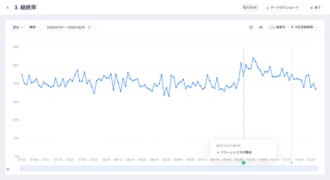 図表04「翌日継続率の推移. 2023年7月から10月」