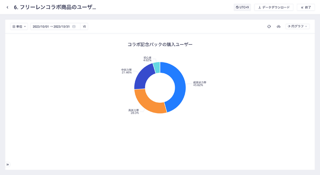 コラボキャンペーンに際しては、コラボ記念パックが複数個販売された。コラボキャンペーン期間中の購入ユーザー数の割合を、妖力(ゲーム内の強さと捉えて良い)別で区分すると、高い妖力帯ユーザーの購入も多く、高課金ユーザーの底上げにも寄与していることがわかった。逆に10月中の新規登録ユーザーはキャンペーン期間後半になるにつれて、コラボパックの購入数も増加しており、ログインボーナスの取得やピックアップガチャなどの施策との連動による効果が見られた。