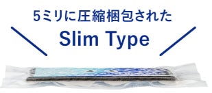 従来品の約6分の1の薄さに圧縮包装された新製品は、わずか5ミリという省スペース設計。ストックにも持ち運びにも便利で、ちょっとした贈り物としても活用できます。開封後は従来品と同じサイズまで形状復帰するため、使い心地は従来品と変わらないのも魅力の一つです。