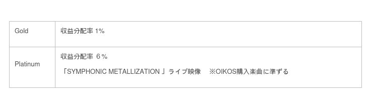 OIKOSとは、楽曲の原盤権をNFTにして販売する新しい音楽支援の仕組みです。各楽曲、GoldとPlatinumの2種類のOIKOSを数量限定販売、ご購入されたOIKOSに応じてライブ映像や収益分配などの特典をご用意しています。