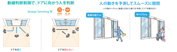 当社は、2011年に自動ドア業界で初めて*、センサーによる動線判断技術で不要な開閉を減らす自動ドアを開発し、2018年に『NATRUS+e』を発売しました。今回新たに発売する『NATRUS+e W』は、近赤外線方式と画像方式の2つのセンサーを組み合わせた動線判断機能を持つ『Image Sensing W』を搭載しています。当社従来製品に比べ新製品では動線判断エリアが約4倍に拡大し、通行者の動きをより的確に判断します(当社調べ)。ドアを通行する人のみに開閉し、不要な開閉を防ぐことで外気の流入を削減し、室内にいる人の快適性を保ちながら空調効率を高め、電力消費の削減に貢献します。