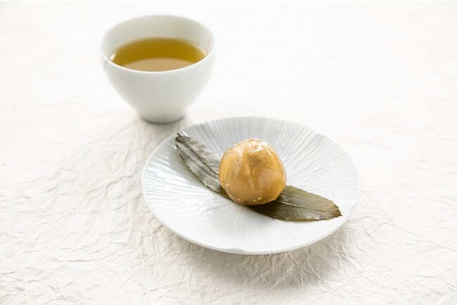 自慢の栗きんとんを涼感のある生地で包みこみ、栗の葉で香りづけをした夏におすすめの栗きんとん水まんじゅうです。