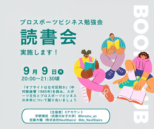 株式会社NextStairs(ネクストステアーズ 本社:福岡県福岡市中央区、代表取締役 CEO:万井拓馬/マンイタクマ)は、スポーツ経営学専門の宇野博武先生(武庫川女子大学)とプロスポーツビジネス勉強会を開催。今回は第一回として課題図書を設定した読書会を行います。ご参加希望の方を募集中です。