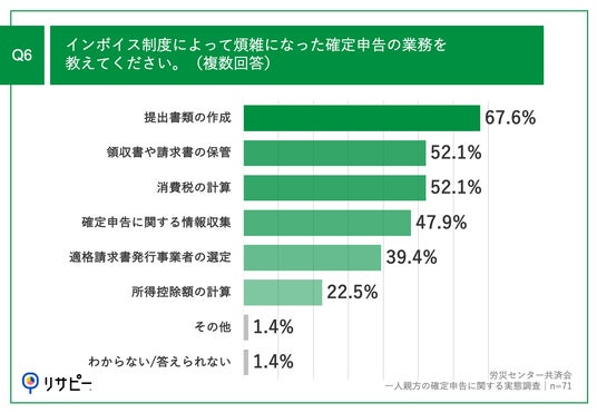 Q5で「非常にそう感じる」「ややそう感じる」と回答した方に、「Q6.インボイス制度によって煩雑になった確定申告の業務を教えてください。(複数回答)」(n=71)と質問したところ、「提出書類の作成」が67.6%、「領収書や請求書の保管」が52.1%、「消費税の計算」が52.1%という回答となりました。