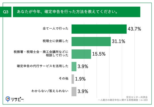 「Q3.あなたが今年、確定申告を行った方法を教えてください。」(n=103)と質問したところ、「全て一人で行った」が43.7%、「税理士に依頼した」が31.1%、「税務署・税理士会・商工会議所などに相談して行った」が15.5%という回答となりました。