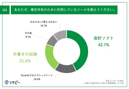 「Q4.あなたが、確定申告のために利用しているツールを教えてください。」(n=103)と質問したところ、「会計ソフト」が42.7%、「手書きの記録」が21.4%という回答となりました。
