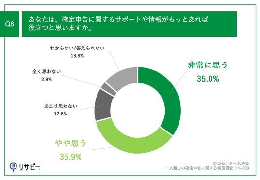 「Q8.あなたは、確定申告に関するサポートや情報がもっとあれば役立つと思いますか。」(n=103)と質問したところ、「非常に思う」が35.0%、「やや思う」が35.9%という回答となりました。