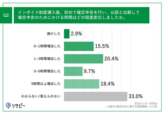 「Q2.インボイス制度導入後、初めて確定申告を行い、以前と比較して確定申告のためにかける時間はどの程度変化しましたか。」(n=103)と質問したところ、「1~3時間増加した」が20.4%、「5時間以上増加した」が18.4%、「0~1時間増加した」が15.5%という回答となりました。