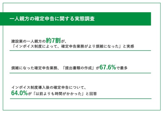 まず、インボイス制度導入後の確定申告について、一人親方の64.0%が「以前よりも時間がかかった」と回答しました。また、今年の確定申告については、「全て一人で行った」が43.7%で最も多く、42.7%が、確定申告のために「会計ソフト」を利用しています。さらに、約7割が、「インボイス制度によって、確定申告の業務が煩雑になった」と実感しており、煩雑になった業務として、「提出書類の作成」(67.6%)などを挙げています。最後に、70.9%から、「確定申告に関するサポートや情報がもっとあれば役立つ」と期待する声が寄せられました。