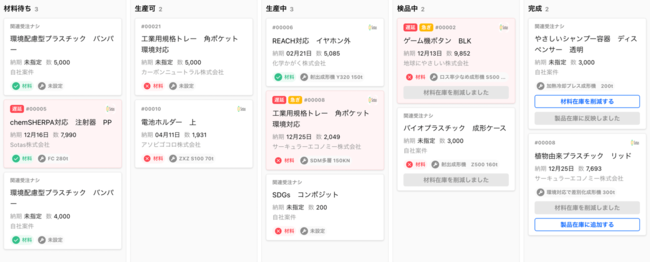 化学産業に属する中小製造業に向けた生産/在庫理ならびに受発注システム。工場で実際に生産工程を管理しているホワイトボードやエクセルをヒントに開発した「カンバン方式」(特許出願済)で、従来と同様に簡単に生産ラインの状況を共有・更新することができます。また、現場と管理者双方が見やすいよう「ガントチャート」とのビューの切り替えも可能です(近日リリース予定)。加えて、業界初のchemSHERPAをはじめとした化学法規対応に特化した機能や電子帳簿保存法、インボイス制度にも対応しています。