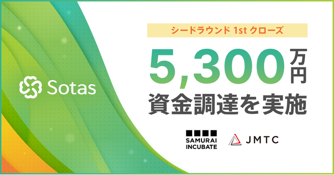「地球に長生きしてもらう」をPurposeに掲げるSotas株式会社(所在地:神奈川県川崎市、代表取締役社長:吉元 裕樹、以下「当社」)は、シードラウンド1stクローズにて、株式会社サムライインキュベートの運営ファンド、日本材料技研株式会社、エンジェル投資家を引受先として、J-KISS型新株予約権の発行による5,300万円の資金調達を実施しました。循環型社会の実現に向けて「Sotas工程管理」「Sotasデータベース」の導入、事業をさらに加速させてまいります。