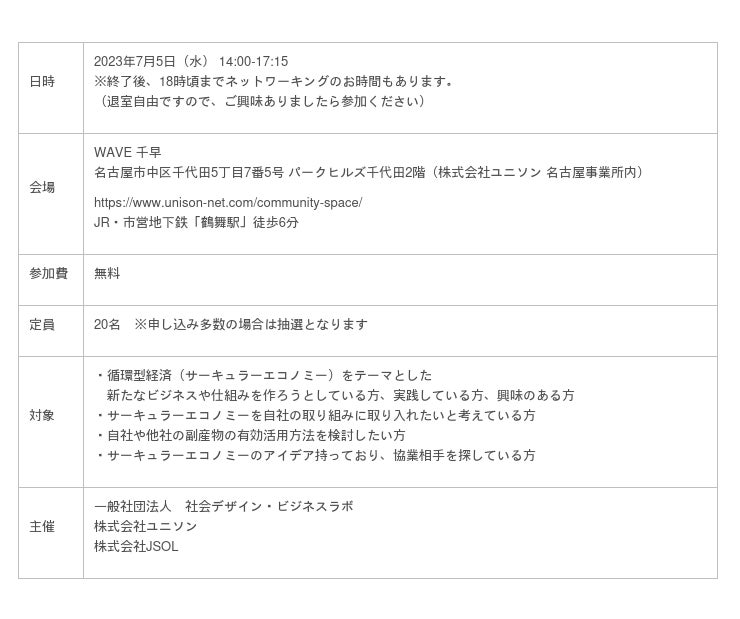 この度、一般社団法人社会デザイン・ビジネスラボの法人パートナー企業である株式会社ユニソン、株式会社JSOLとの共同プロジェクトとして、『循環型ビジネスの共創コミュニティ』を新たに東海エリアで立ち上げることとなりました。