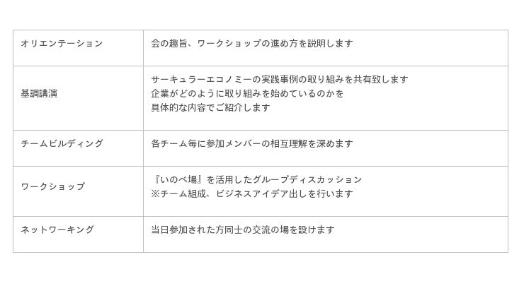 今回のKickOffイベントでは、参加される皆様とともに、サーキュラーエコノミーの潮流を知りながら、双方の関係性づくりのきっかけを生み出す場にしたいと考えております。