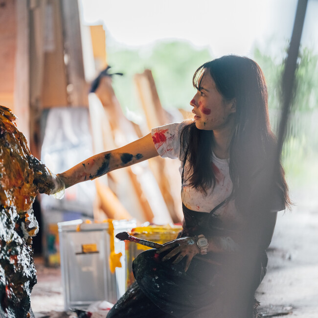 水戸部七絵は、一斗缶に入った油絵具を手掴みで塗り描き、圧倒的な量感をもって立体性のある絵画を描く作家です。代表作「DEPTH」シリーズでは、抽象性の高い匿名のポートレートを通して絵画の本質を探求しています。昨年からオーストリアのウィーン美術アカデミーに交換留学中の水戸部は、現地では色彩に関するリサーチを行い、ゲーテ色彩学にも通じる独自のアプローチで手がけた新作を展示します。