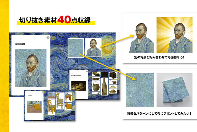 作品から「モチーフ」と「背景」を切り分け、オリジナルデータを作成しました。 面倒な切り抜きの作業が必要ないので、モチーフだけをご自身のデザインに加えることも簡単にできますし、 背景だけを加工してデザインに仕立てることもできます。ゴッホ作品の40点を切り抜き加工して収録しています。