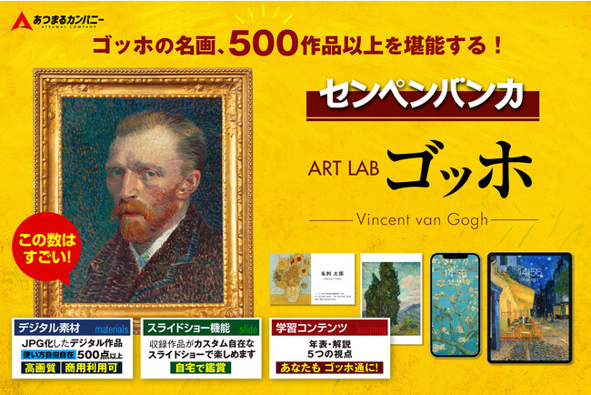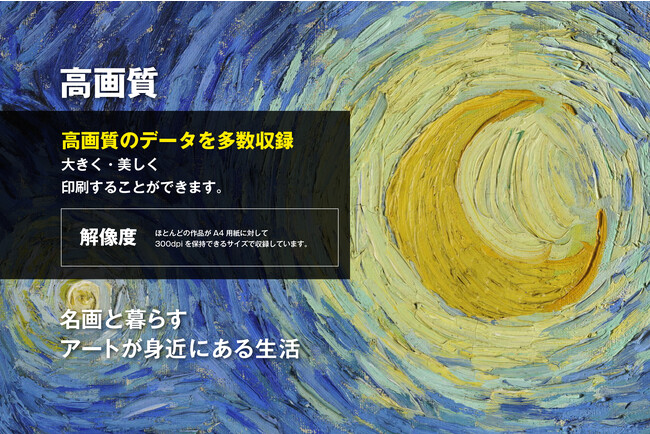 「アートラボシリーズ」第2弾は、オランダ出身の画家「フィンセント・ファン・ゴッホ」に焦点を当てた製品です。前作では、世界的に有名なストリートアーティスト「バンクシー」の作品を取りあげましたが、今作では、日本でも絶大な人気を誇る「ゴッホ」を取りあげました。本製品は、収録されている作品データ全てが商用利用可能な「素材集」であるという点に加え、「高画質デジタルデータ」であるという特性を活かし、作品を細部まで拡大し、手軽に鑑賞することができます。美術館とはまた異なる視点から、自宅に居ながらゴッホの筆致や、表現する情熱や感性を深く感じることができるのも本製品の特徴のひとつです。
