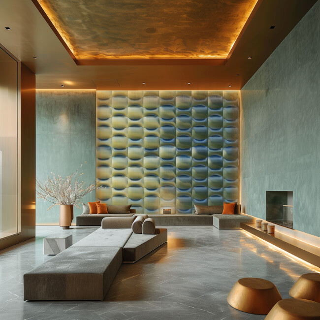 ”Effective Skin”は、空間にダイナミックな色変化をもたらす、壁面パネリングシステムです。積彩独自の同時多色3Dプリンティング手法を用いて、同一の機械と同一の素材から数えきれないほど多くの新しい表現を生み出しています。生み出されるサーフェスはどれも「何色」と定義することのできない揺れ動く色彩であり、生命が持つような曖昧で多層な色味の美を体現しています。