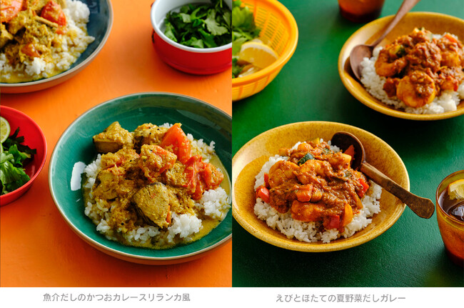 この暑い時期におすすめなのは「熱冷」が楽しめる冷やしだしカレー。薬味をトッピングしてさっぱり食べられます。また、トマトと梅干しのクエン酸が味のアクセントとなるカレーをはじめ、野菜、肉、魚、豆類などいろいろな素材を使って春夏秋冬楽しめるだしカレーが満載です。