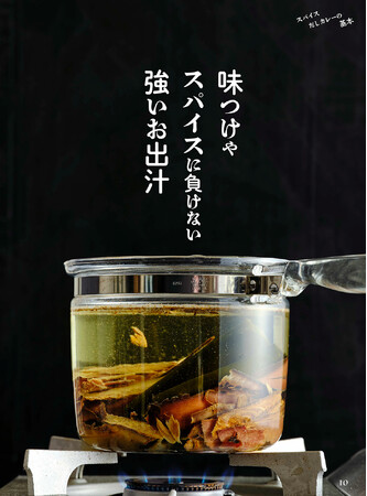 だしカレーの主役となる「お出汁」。本書で紹介する素材は煮干し、かつお節、さば節、昆布、えびの殻。これらを掛け合わせて得られる相乗効果により、だしは飛躍的にうま味が強くなります。本書では、味つけやスパイスの香りに負けない「強いお出汁」を取ることを基本とした「だし」の取り方をご紹介。