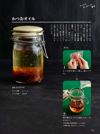 だしカレーの味を形成する上で欠かせないのが仕上げのオイル。だしカレーの風味を倍増させ、お出汁の香りをグンと引き立てます。本書では、煮干しオイル、かつおオイル、えびオイルの作り方をご紹介。これらのオイルはラーメンやうどんにかけても美味しいオイルです。