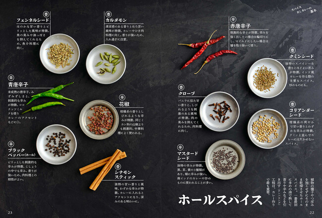 市販のカレールウなどで作る家庭のだしカレーと違うところがスパイス使い。本書では、市販のカレールウやカレー粉は使わずに、ホールスパイスやパウダースパイス、ハーブを使用し、カレー特有の香り・辛味・色をつけ、また、玉ねぎ、にんにく、しょうが、トマトでだしカレーの味のベースを作っています。