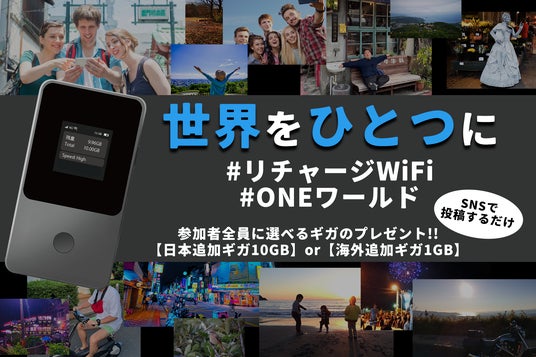 特別キャンペーンのお知らせです。“世界をひとつに” 、と感じられる瞬間を捉えた写真を、ハッシュタグ「#リチャージWiFi #ONEワールド #PRギガプレOW」と共にSNSに投稿してください。海外の風景、外国料理、または日本の「ONEワールド」なシーン。あなたの世界観を、ぜひシェアしましょう。