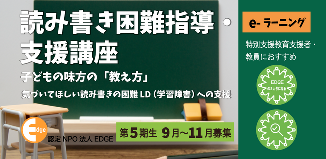 東京都港区の認定NPO法人エッジ(会長:藤堂栄子)は、読み書きの困難がある子どもたちへの学習支援を実践的に学べるe-ラーニング、【読み書き困難指導・支援講座】第5期を2023年9月1日に開講します。