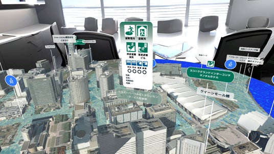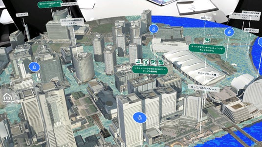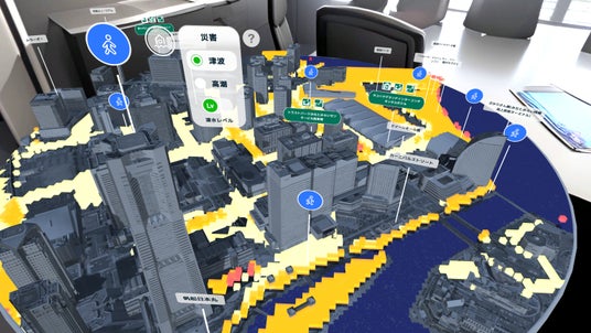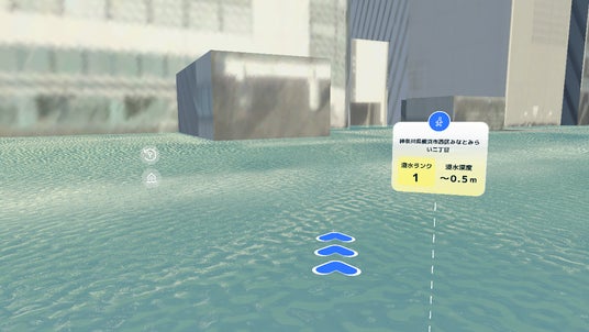 都市は平面地図ではなく3Dジオラマで表示され、浸水する場所が水で覆われます。上空から水害を見ることで、どこが危険な区域なのかが直感的にわかります。また、避難所の情報も表示されているので、水害が発生した際にどこに避難すれば良いかが一目でわかります。