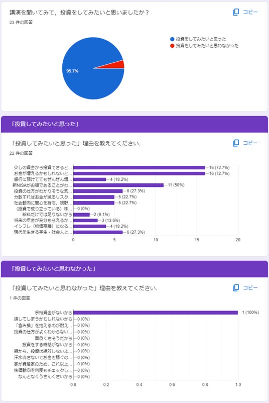 今回の講義を聞いてくださった学生さんに簡単なアンケートを取らせていただいた結果、95.7%の参加者さんから「講演を聞いてみて、投資をしてみたいと思った」との回答が!