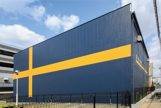 カラフルファクトリーを展開していく弊社では、日本一カラフルな企業を目指し、前年2023年5月に竣工した第二社屋をカラフルファクトリーと命名。正面は朝焼けの富士をイメージした「始まり」を予感させる晴色と濃紺のグラデーション。裏面には極夜に明るく過ごせるようにカラフルでポップなデザインが多い、というデザイン元となった北欧の国旗をイメージしたデザインが施されています。